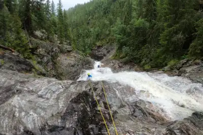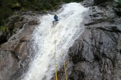 Tenhle vodopád totiž není vertikální a padá pod úhlem asi 60 stupňů. Asi v jedné třetině od spodu se ale zužuje a vytváří něco jako vanu. Takže všechna ta voda, která se shora, kde je šířka kolem 6 metrů, padá dolů a slévá se v jednom místě zhruba jeden metr na šířku. A tohle je přesně to místo, kde klienty odvazujeme ze slanění. Když je tady ale vycvaknem ze slanění, vodopád ještě nekončí. Za běžných podmínek s klienty přeskočíme proud vody, přejdeme na druhou stranu vodopádu a odtud skáčeme do jezera. Jinak to nejde udělat, protože přímo pod vodopádem je asi 2,5 metru velký boulder, o který by se kdekdo dokázal ein zwei zabít.